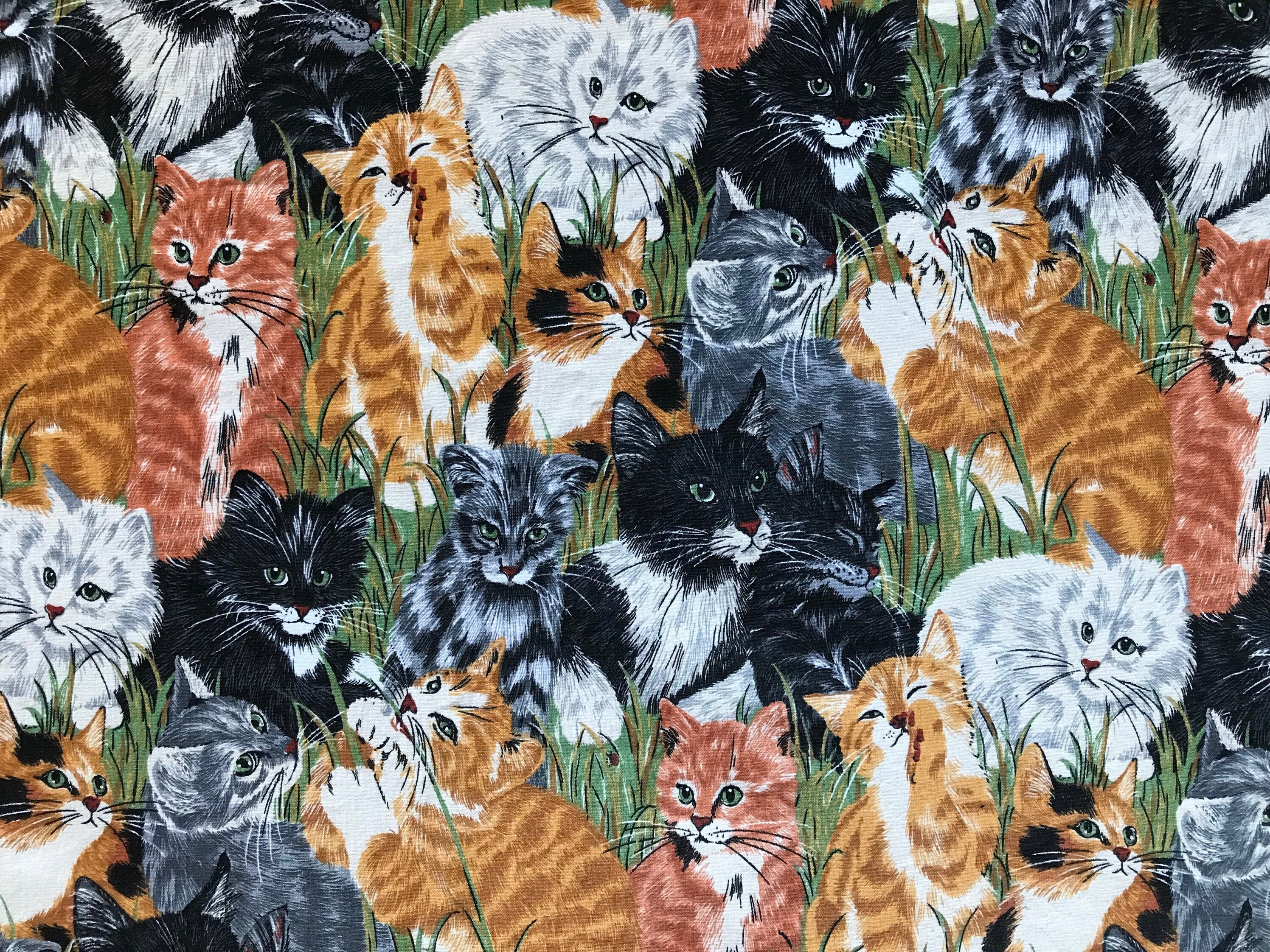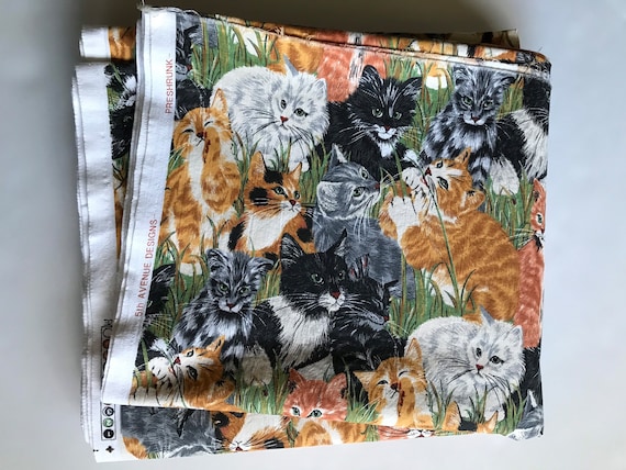 Vintage Cat Print Fabric Realistic Looking Cats In Grass Etsy